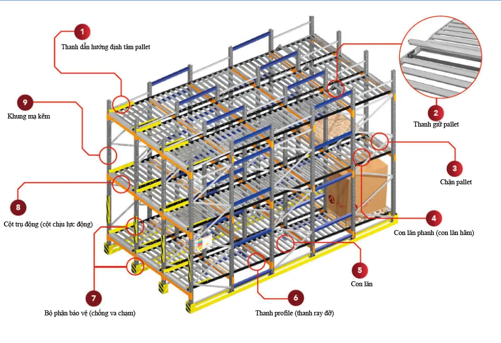 – Con lăn: để hàng trượt trên ray, từ đầu chỗ nhập hàng đến cưới chỗ xuất. Sử dụng con lăn giúp giảm ma sát khi pallet di chuyển. Giữ pallet hàng trượt đi thẳng, không xô lệch.