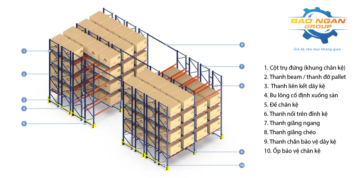 – Thanh liên kết: Liên kết hai khung trụ Omega của 2 dãy kệ lại với nhau. Kệ càng cao thì số lượng thanh liên kết càng nhiều để gia tăng độ chắc chắn.