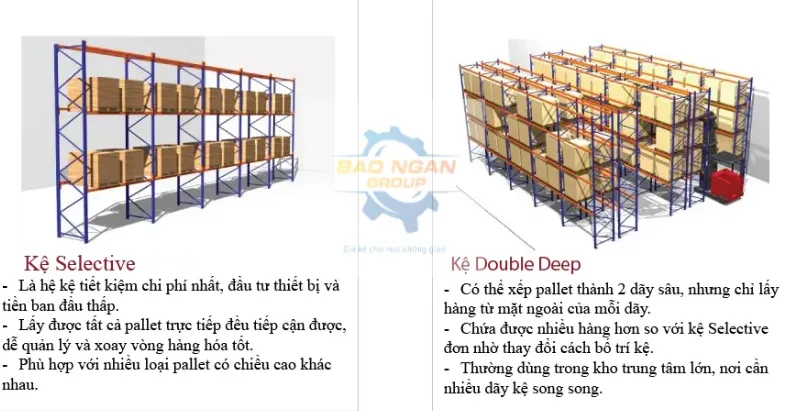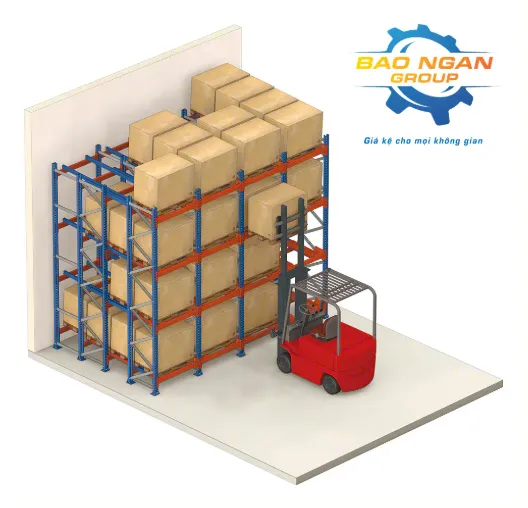 - Nếu kệ Selective vẫn chưa tận dụng hết diện tích kho của bạn, thì kệ Double Deep chính là bước nâng cấp đáng cân nhắc. Đây là giải pháp giúp chứa được nhiều pallet hơn trên cùng mặt bằng, đặc biệt phù hợp với kho có không gian hạn chế.
