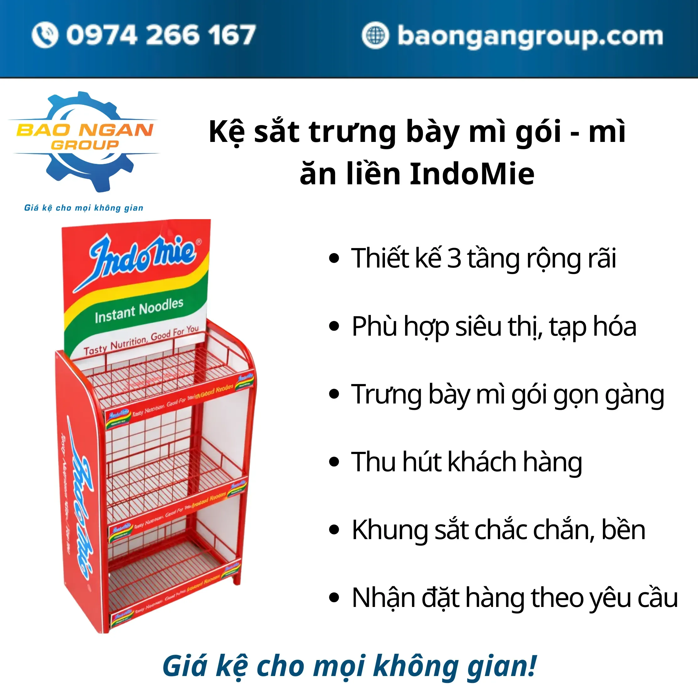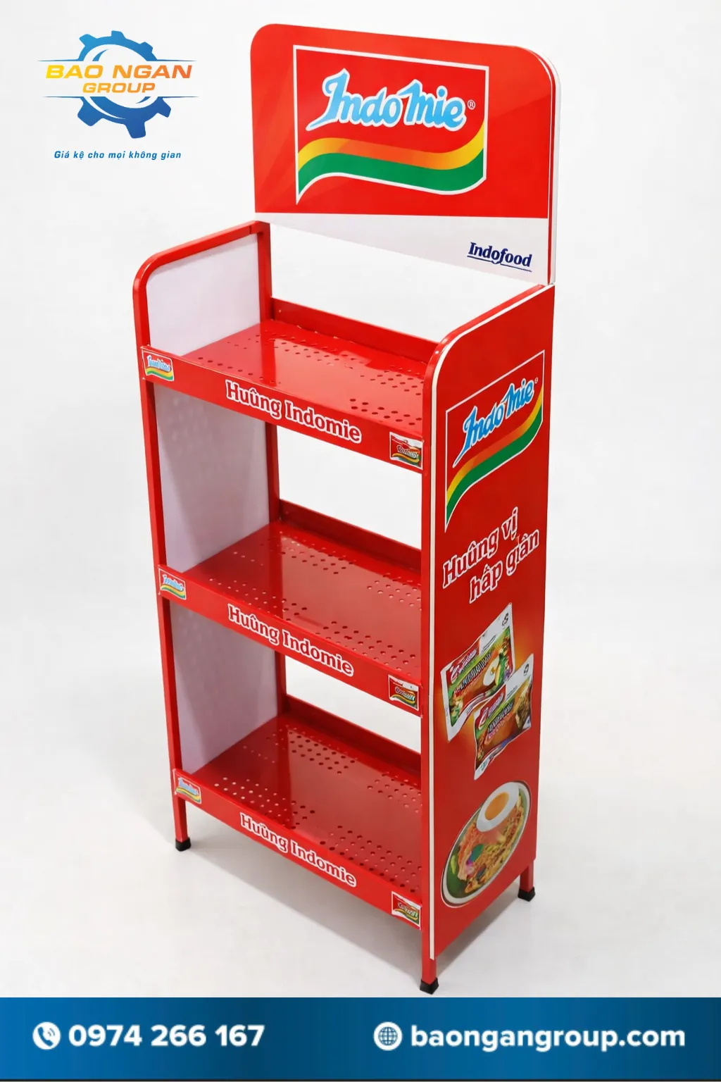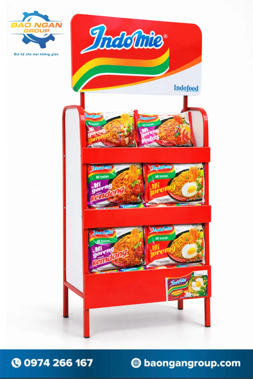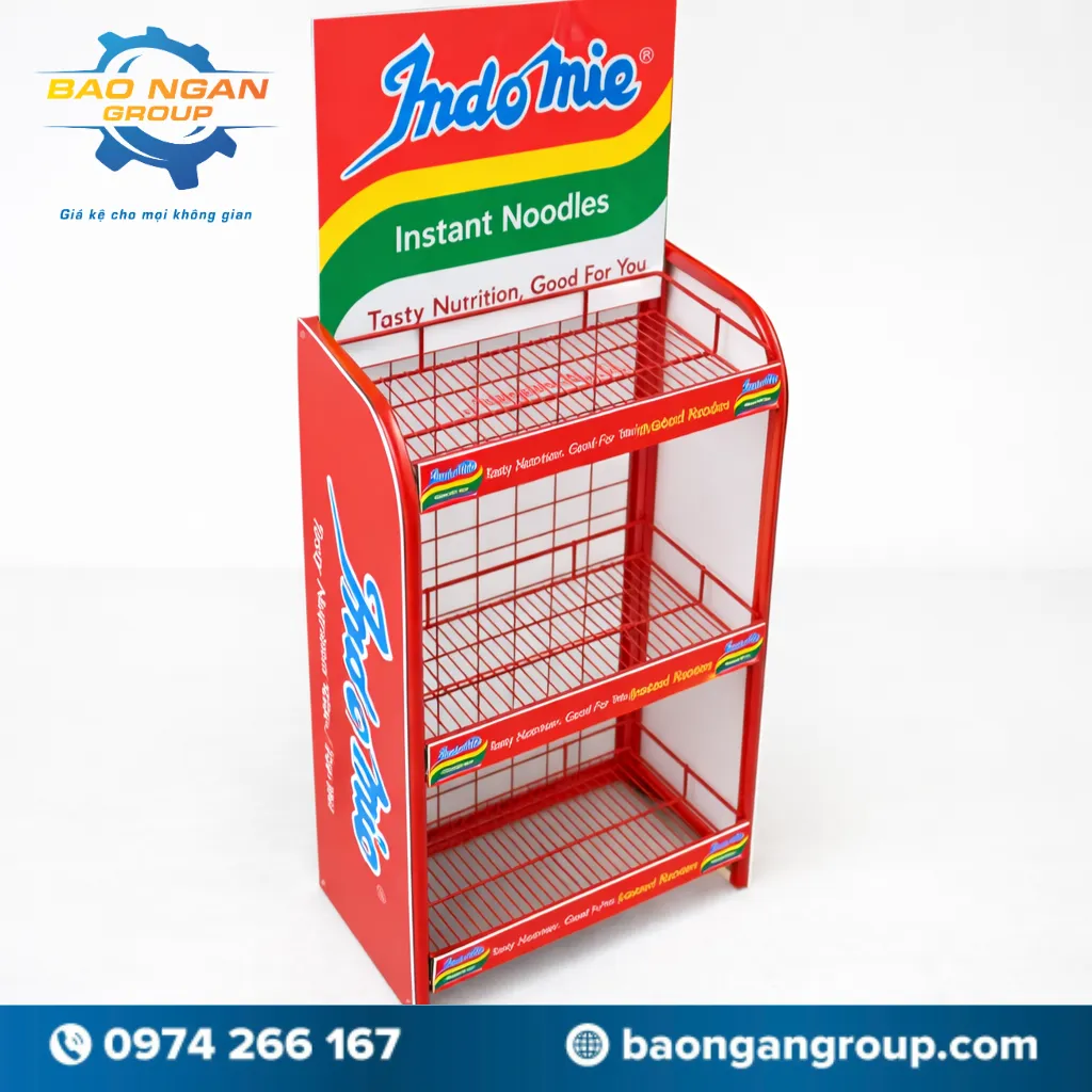 - Một trong những mẫu được nhiều cửa hàng lựa chọn là kệ sắt trưng bày mì Indo Mie. Mẫu kệ này thường được thiết kế 3 tầng chắc chắn, khung sắt sơn tĩnh điện màu đỏ nổi bật. Phần bảng quảng cáo được in trên chất liệu fomex, giúp hình ảnh thương hiệu rõ nét và thu hút khách hàng ngay từ xa.