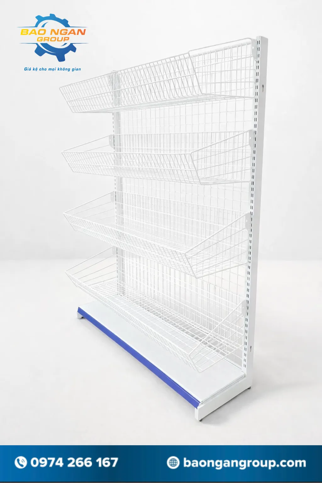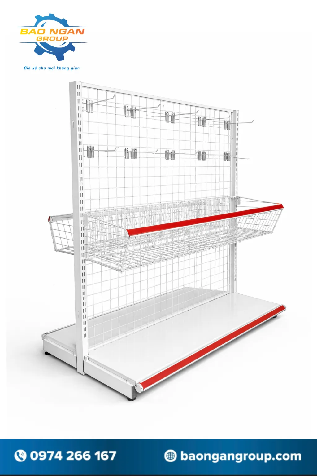 Nếu cửa hàng cần trưng bày nhiều mì gói hơn và tận dụng tốt diện tích, bạn có thể tham khảo kệ lưng lưới của Bảo Ngân Group. Kệ được làm từ sắt sơn tĩnh điện chắc chắn, thiết kế nhiều tầng giúp trưng bày được nhiều sản phẩm, gọn gàng và dễ sắp xếp. Phù hợp cho tạp hóa, siêu thị mini và cửa hàng tiện lợi. Ngoài ra, kệ có thể sản xuất theo kích thước yêu cầu, giúp tối ưu không gian bán hàng và làm nổi bật sản phẩm mì gói tại điểm bán.