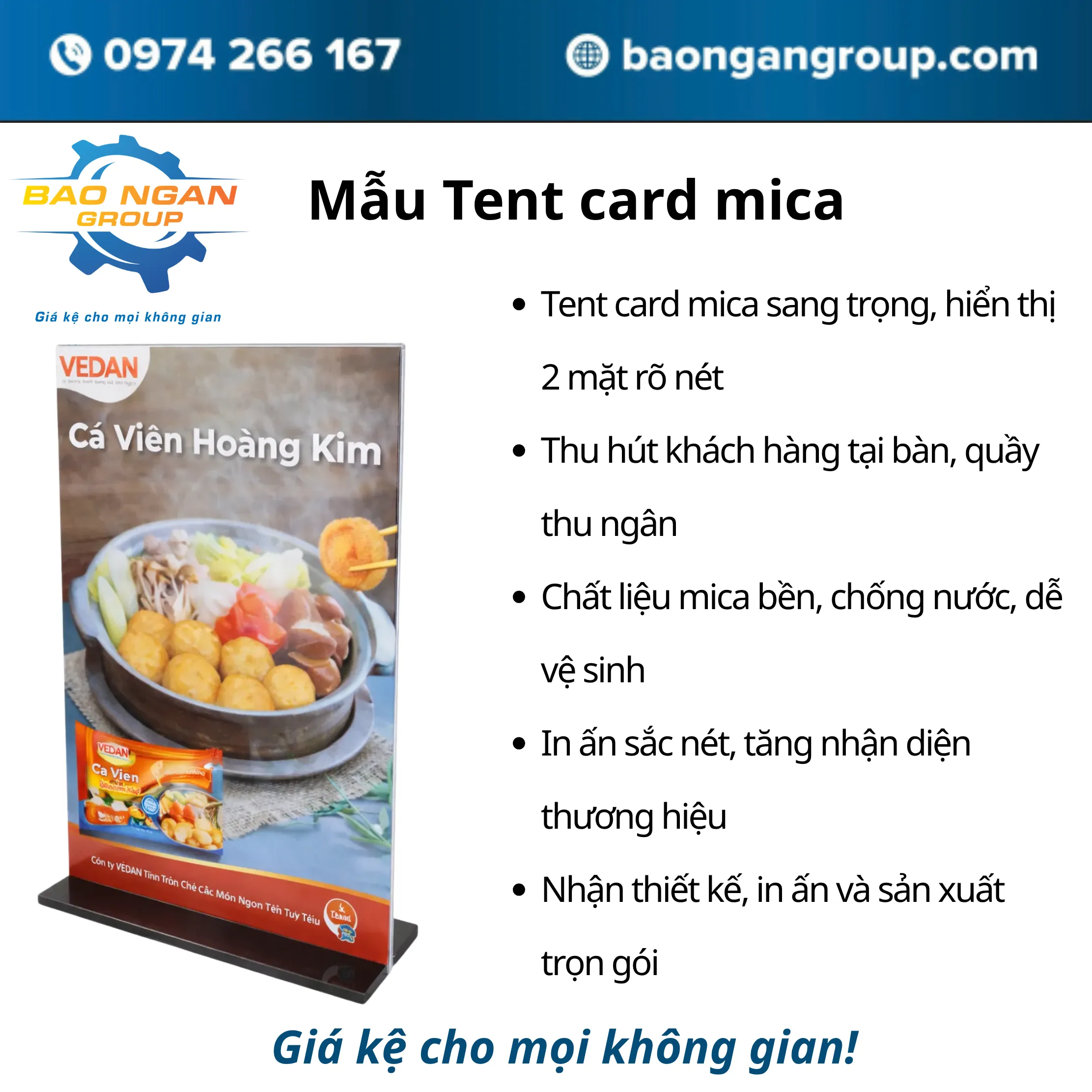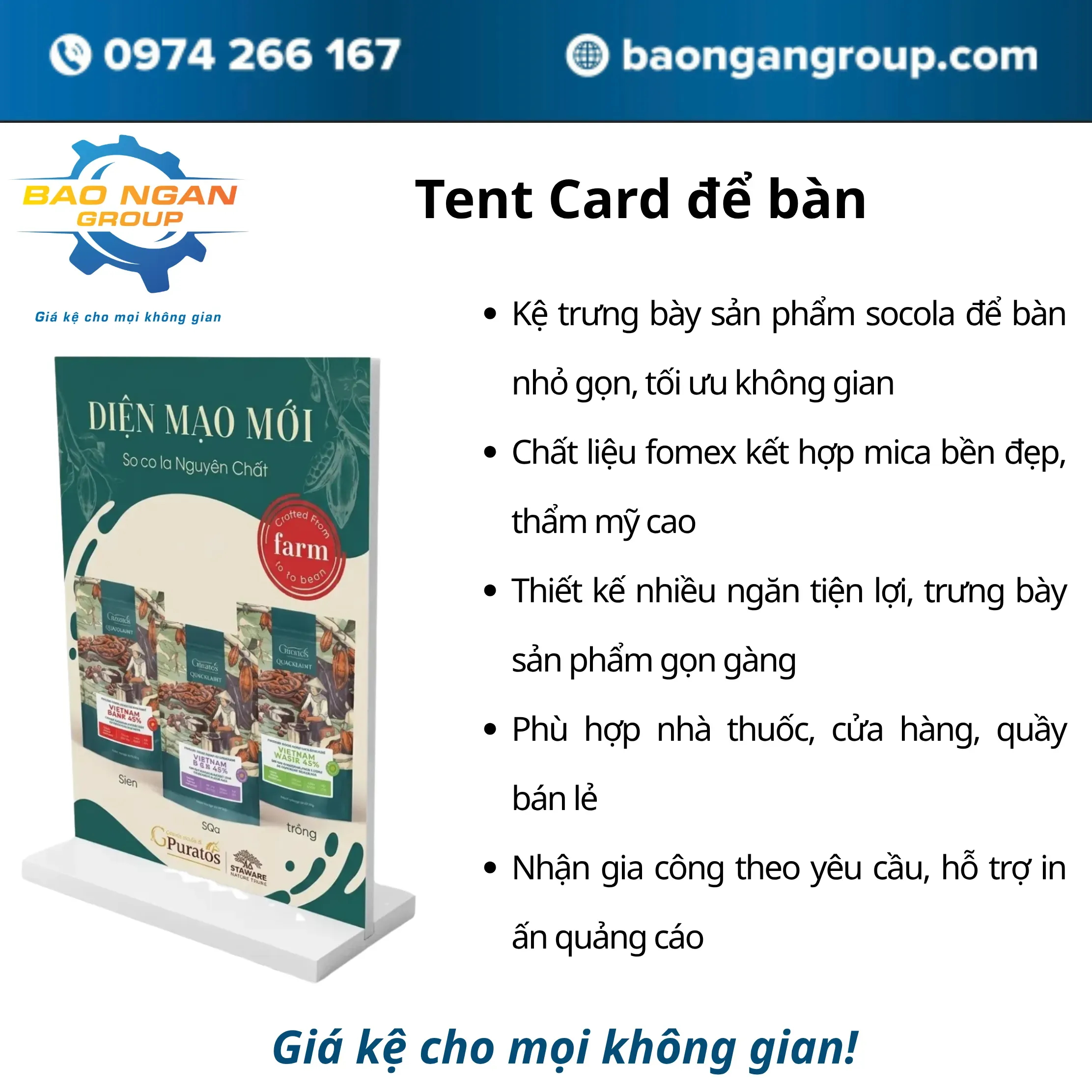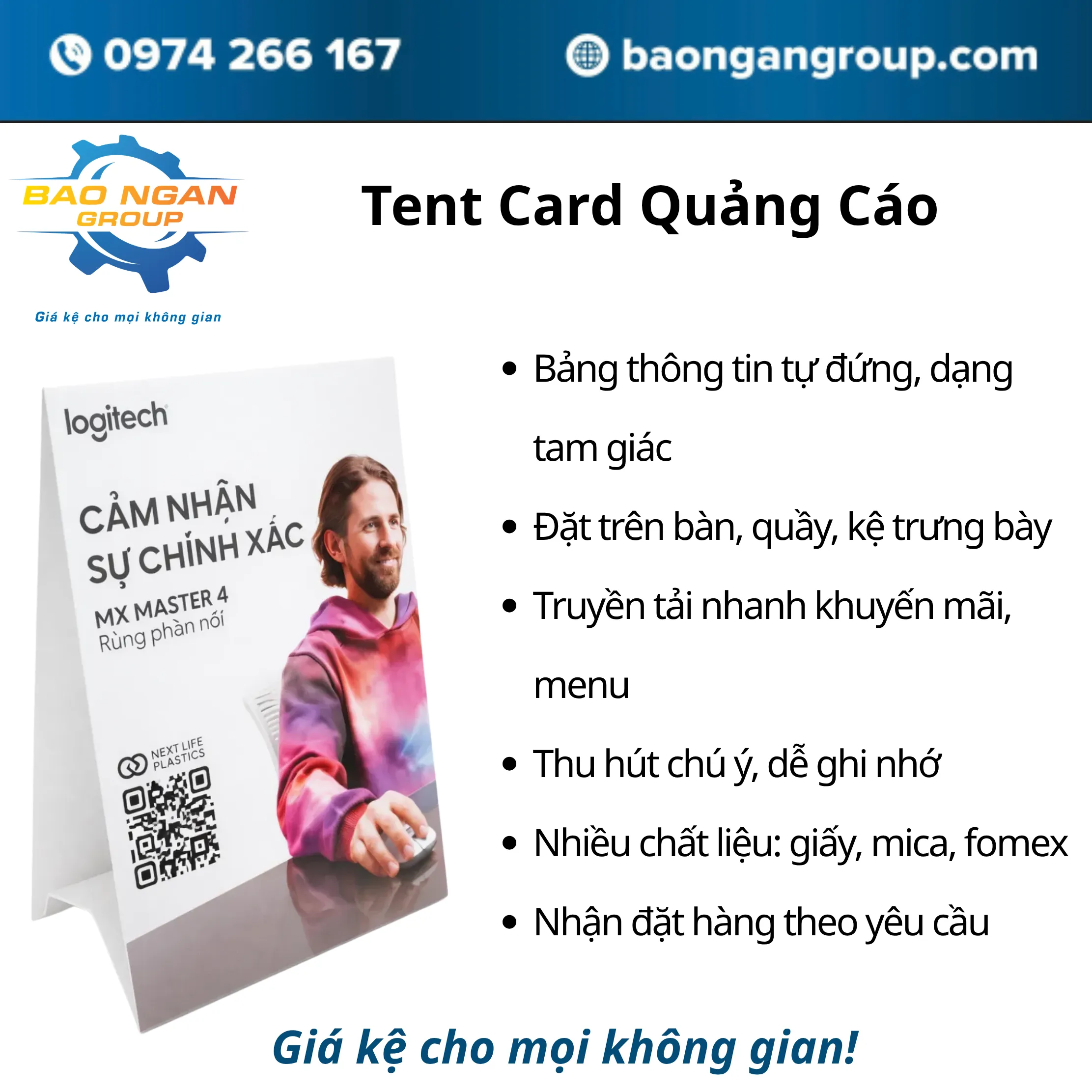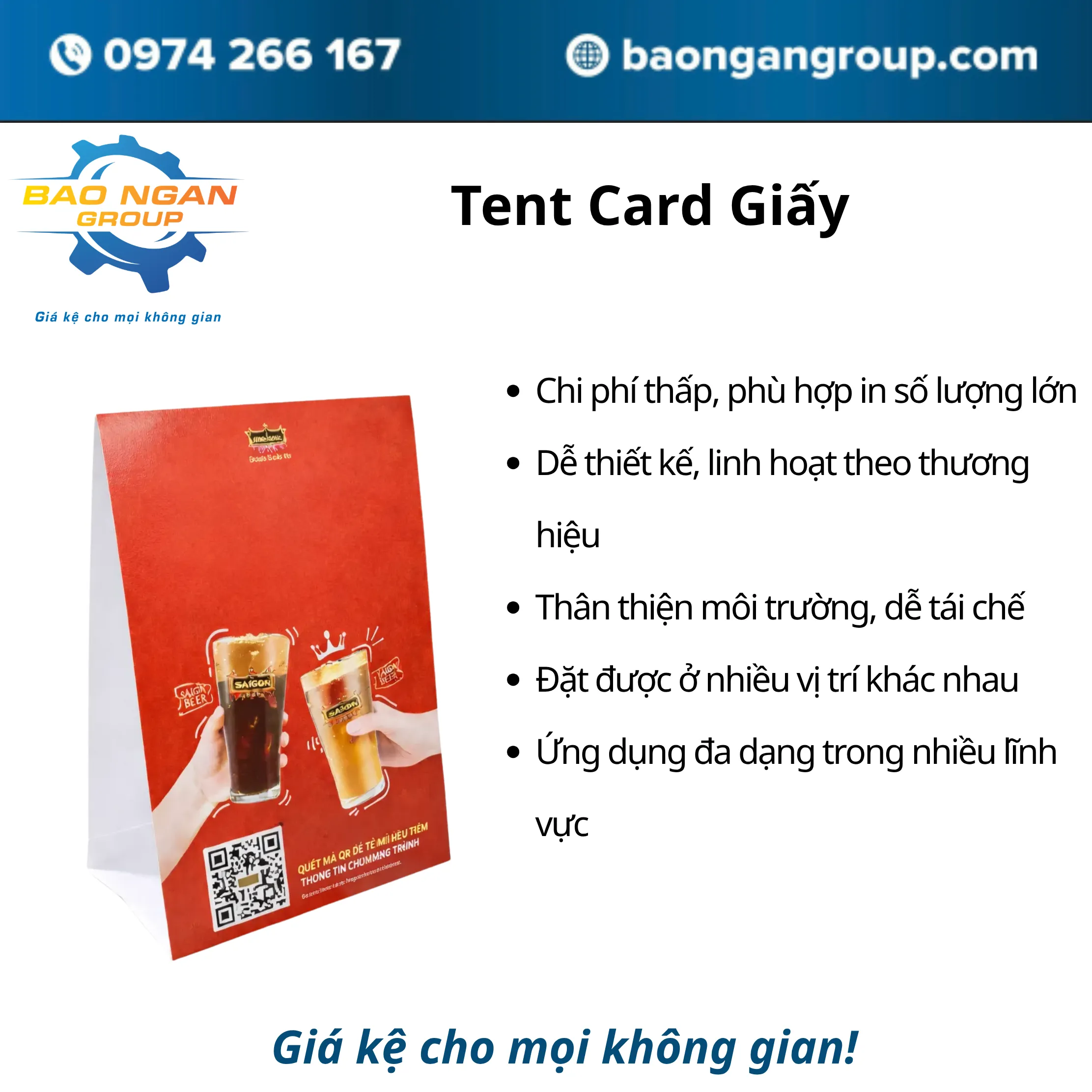 Tent Card – Giá kệ Bảo Ngân là giải pháp quảng cáo để bàn nhỏ gọn, hiệu quả cao, phù hợp cho quán cafe, nhà hàng, cửa hàng tiện lợi và showroom. Sản phẩm được sản xuất trên nhiều chất liệu như fomex, mica, giấy, đáp ứng đa dạng nhu cầu sử dụng.