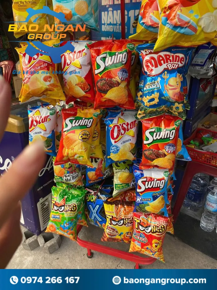 - Trong các cửa hàng tạp hóa, siêu thị mini hay quầy bán đồ ăn vặt, bim bim, snack, bánh tráng là những sản phẩm bán rất chạy. Vì vậy việc trưng bày gọn gàng, dễ nhìn sẽ giúp khách hàng chú ý và mua nhiều hơn. Kệ sắt trưng bày bim bim của Bảo Ngân là giải pháp đơn giản nhưng hiệu quả cho các điểm bán lẻ.