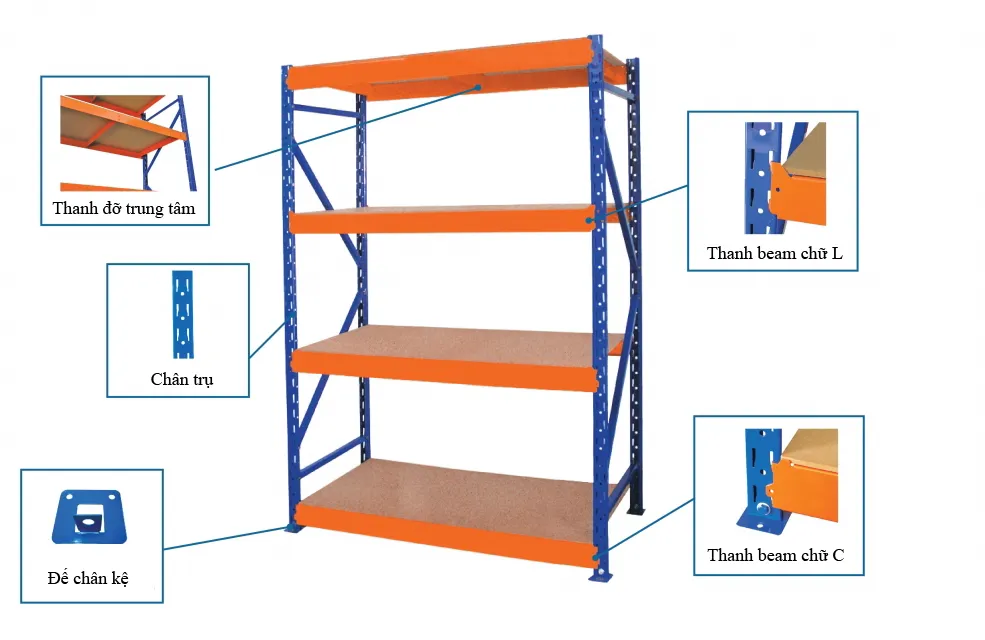+ Thanh giằng: Bao gồm giằng ngang và giằng chéo, được bắt vít cố định hai bên hông kệ. Bộ phận này giúp phân tán lực, hạn chế rung lắc, chống nghiêng ngả trong quá trình sử dụng.