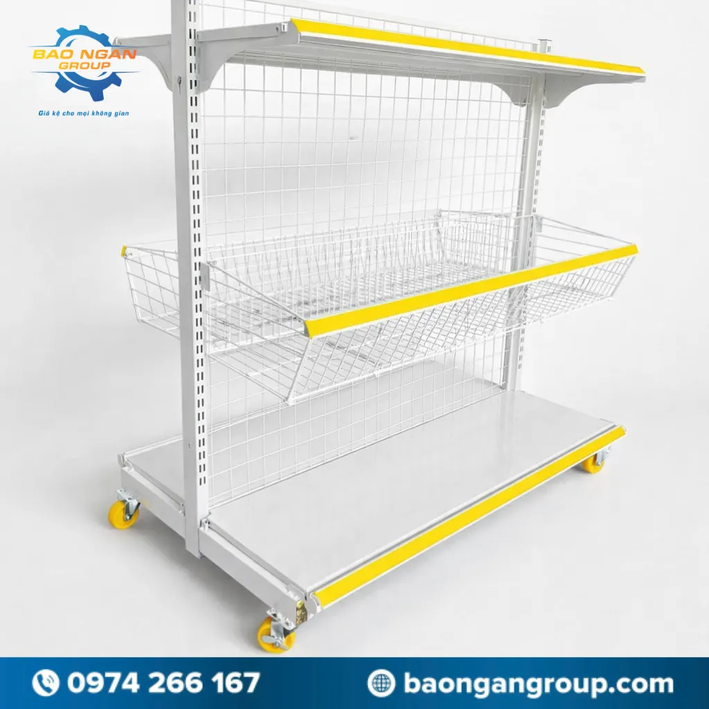 Nếu cửa hàng cần trưng bày nhiều mì gói hơn và tận dụng tốt diện tích, bạn có thể tham khảo kệ lưng lưới của Bảo Ngân Group. Kệ được làm từ sắt sơn tĩnh điện chắc chắn, thiết kế nhiều tầng giúp trưng bày được nhiều sản phẩm, gọn gàng và dễ sắp xếp. Phù hợp cho tạp hóa, siêu thị mini và cửa hàng tiện lợi. Ngoài ra, kệ có thể sản xuất theo kích thước yêu cầu, giúp tối ưu không gian bán hàng và làm nổi bật sản phẩm mì gói tại điểm bán.